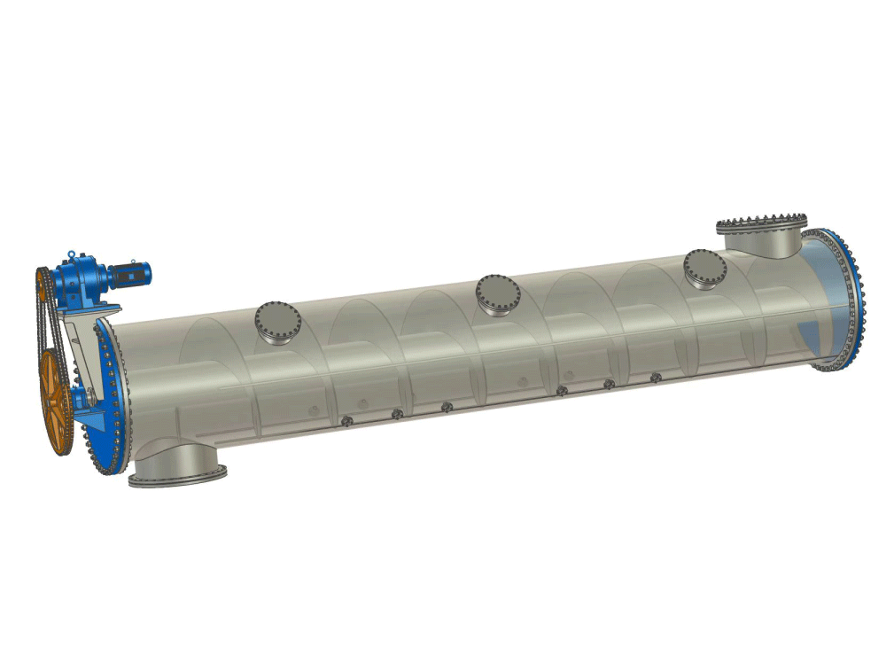 螺旋式蒸煮管內設有螺旋軸,當螺旋軸旋轉時,螺旋葉片推動物料沿著管體軸向移動。由于螺旋結構的特性,物料在移動過程中同時還會產生一定的翻轉和攪拌效果,使物料在輸送過程中能夠和內部的蒸汽以及化工藥液均勻混合,保證了物料在蒸煮管內均勻快速的加熱與反應。